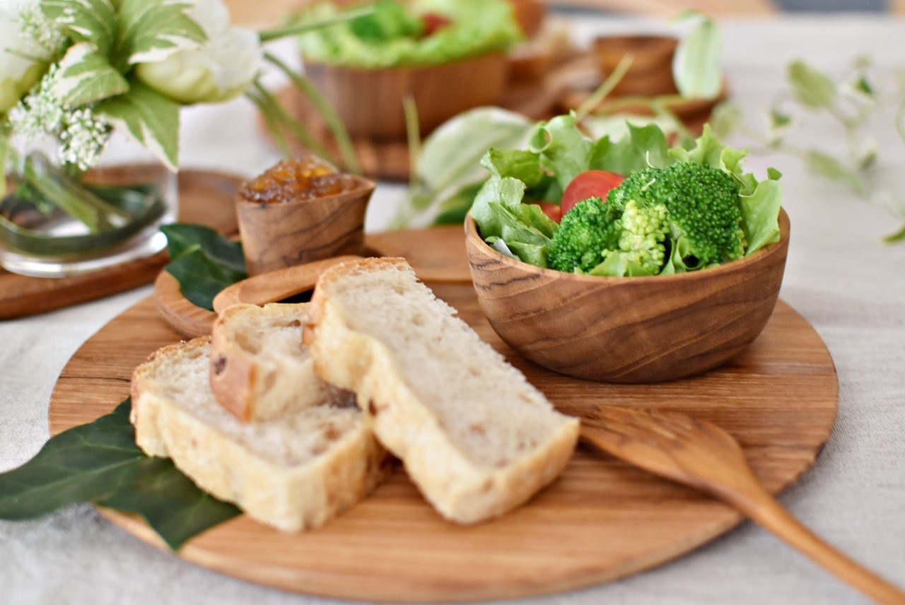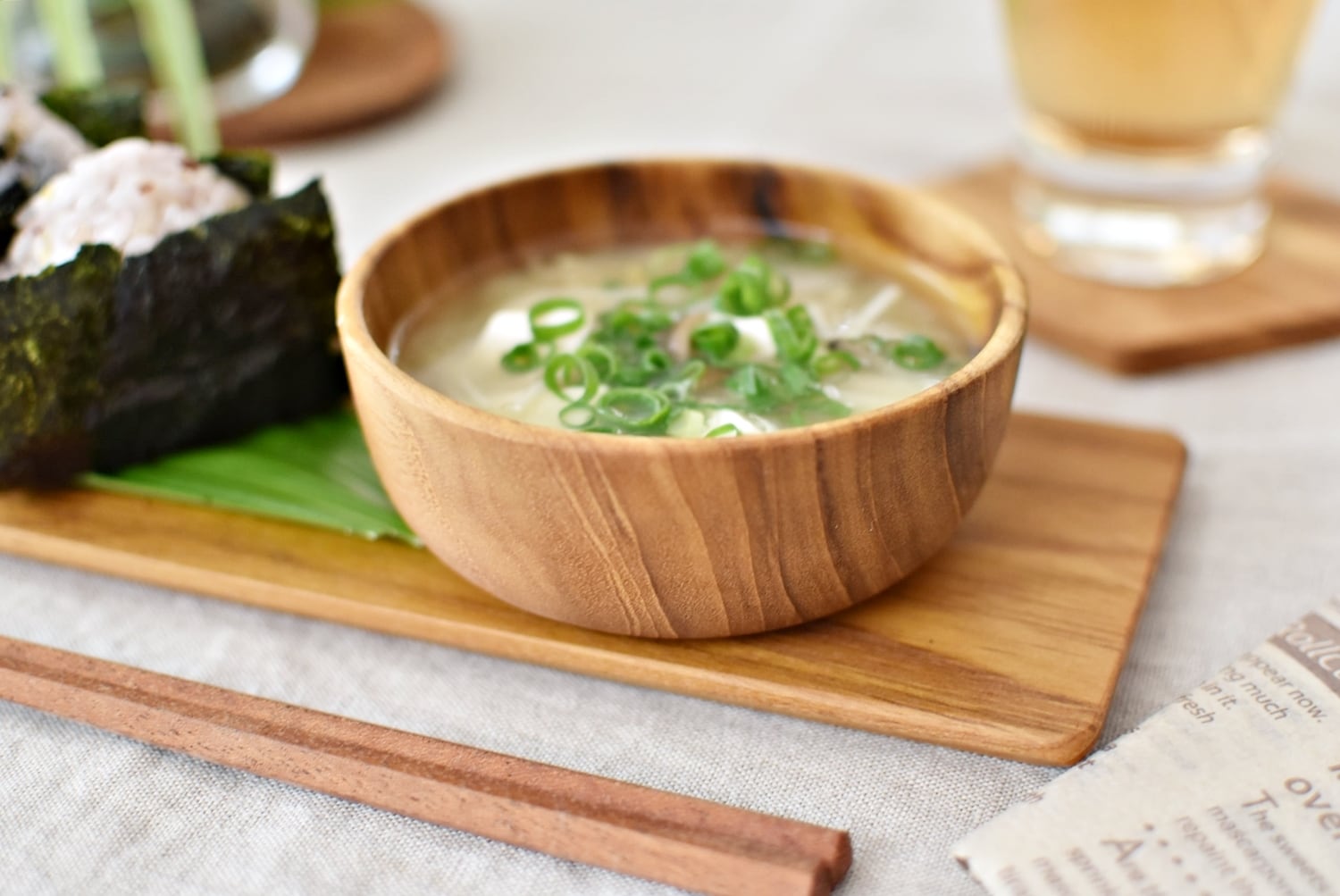 木の器を使うだけで、お味噌汁の時も和に偏らずに使えます。