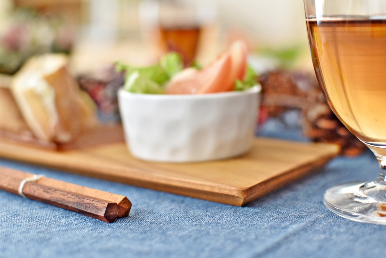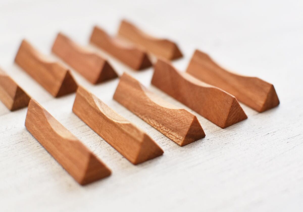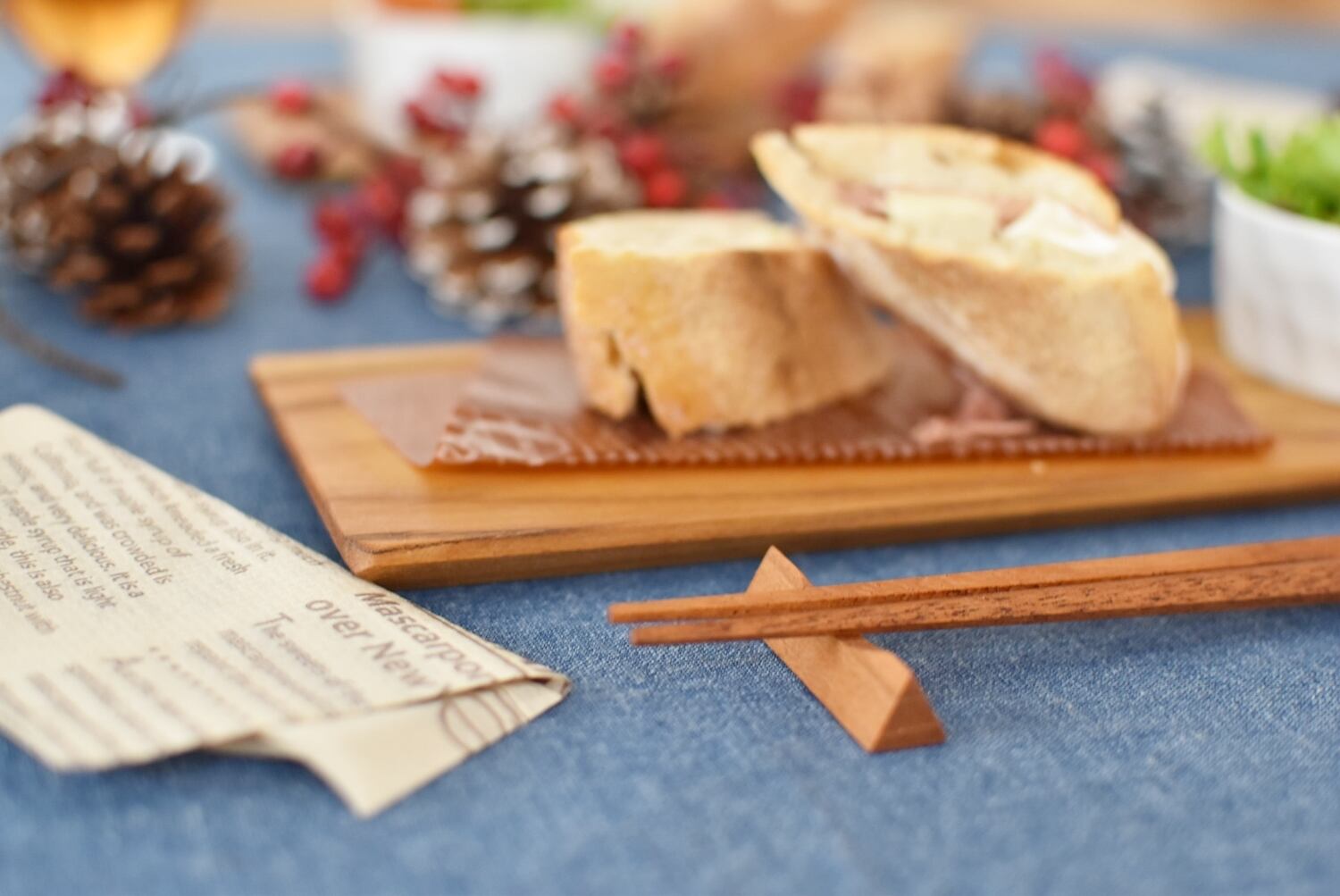 木の素材の箸置きや箸は、どうしても和の雰囲気が出てしまうものが多くありましたが、この五角箸はスッキリとした形と色が洋にも合わせやすいモノになっています。この箸置も形がシャープなので、和に偏り過ぎずに洋にも合わせやすい形です。