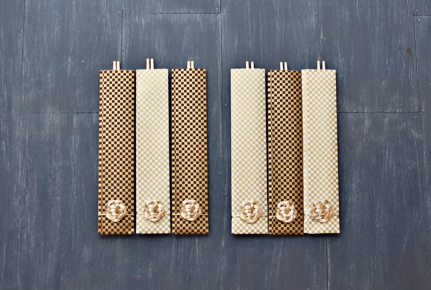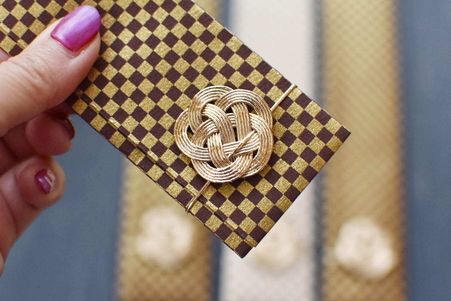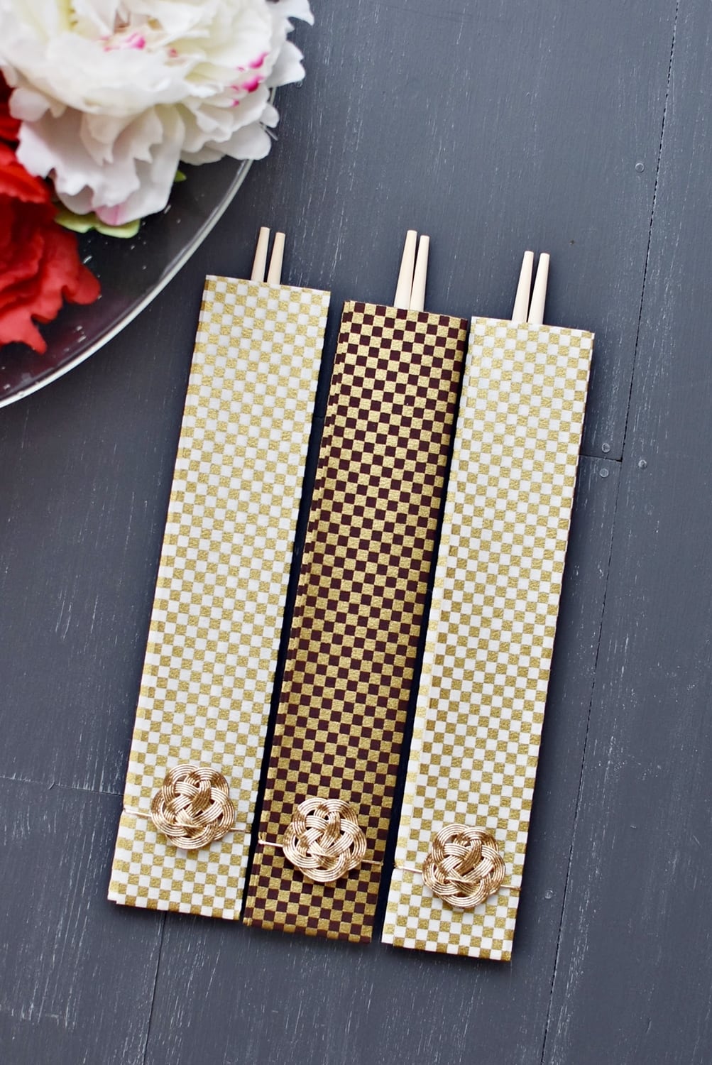 モダンな柄の和紙で作った箸袋と水引で包みました。